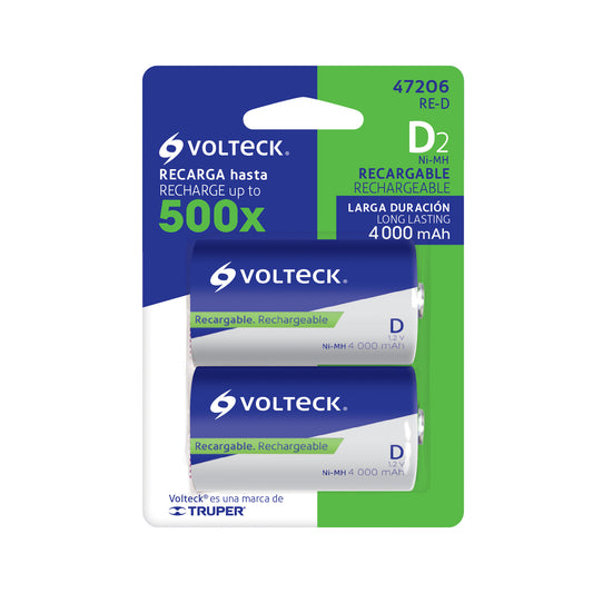 Proveedor:VolteckBlíster con 2 pilas recargables D larga duración, 4000 mAh Caja con 6, 47206Duran hasta 500 ciclos de recarga Entre mayor sea el número de mAh, mayor será el desempeño de la pila...