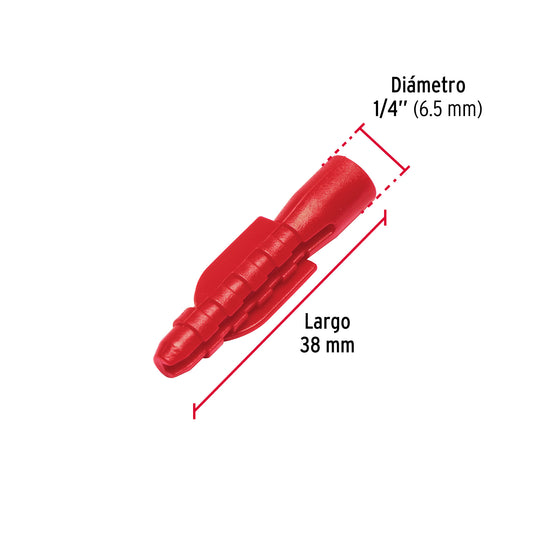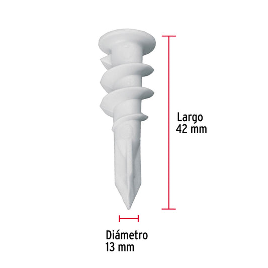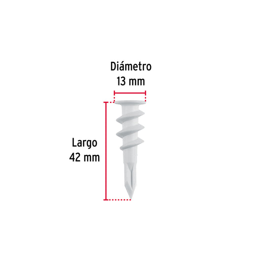 Proveedor:FieroBolsa c/100 taquetes plásticos 1/2', p/panel de yeso, Fiero Caja con 4, 42008Autotaladrantes, no requieren taladrar previamente Para panel de yeso de 3/8" a 1" de espesor