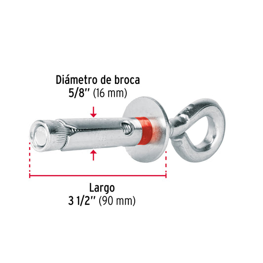 Proveedor:Fierotaquetes expansivos 16x90 mm con armella cerrada Caja con 25, 45737Fabricados en acero con acabado galvanizado Anclaje antigiro Para fijar en concreto, piedra o ladrillo