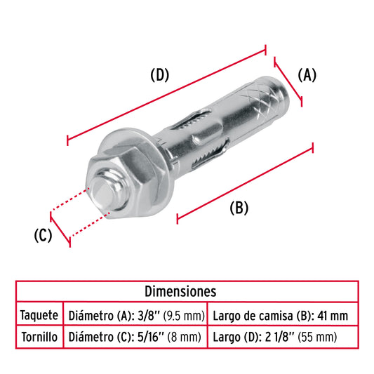 Proveedor:FieroBolsa con 4 taquetes expansivos de 5/16' con tornillo, Fiero Caja con 12, 44361Fabricados en acero con acabado galvanizado Taquete montado Para fijar en concreto
