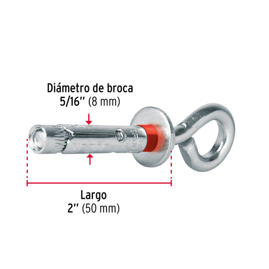 Proveedor:Fierotaquetes expansivos 8x50 mm con armella cerrada Caja con 100, 45734Fabricados en acero con acabado galvanizado Anclaje antigiro Para fijar en concreto, piedra o ladrillo