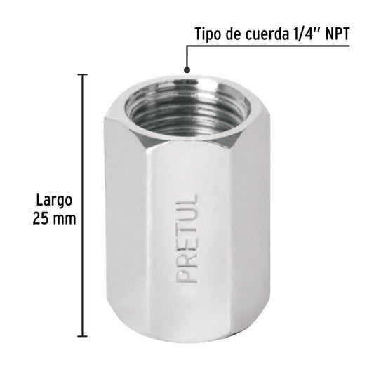 Proveedor:PretulCople acero, cuerda 1/4 NPT, Pretul Caja con 6, 27027Fabricado en acero cromado Para la unión de conectores macho Ideal para compresores de aire y herramientas neumáticas