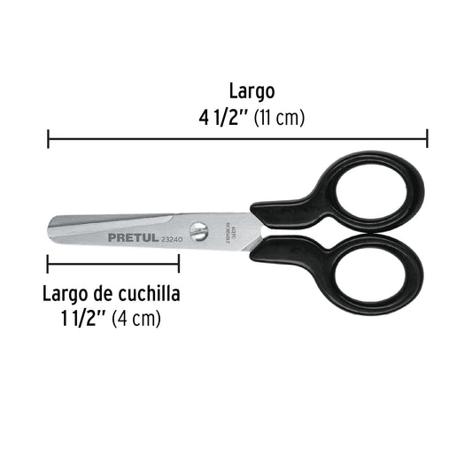 Proveedor:PretulTijera 4-1/2' de acero inoxidable punta roma escolar, PRETUL Caja con 12, 23240Hojas de acero inoxidable y mangos de ABS Punta roma para mayor seguridad Para trabajos escolares y manualidades Ideal para...