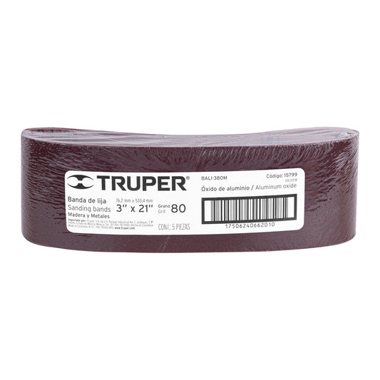 Proveedor:Truper1 banda de lija 3 x 21' p/madera grano 80 en paquete de 5 Caja con 5, 15799Fabricado en óxido de aluminio Respaldo de tela de larga duración Para desbaste, remoción y nivelado de superficies