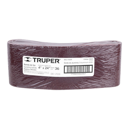 Proveedor:Truper1 banda de lija 4 x 24' p/madera grano 36 en paquete de 5 Caja con 5, 15823Fabricado en óxido de aluminio Respaldo de tela de larga duración Para desbaste, remoción y nivelado de superficies