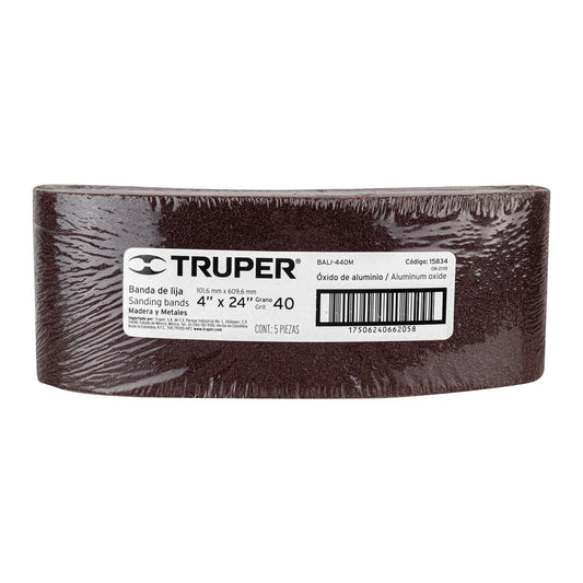 Proveedor:Truper1 banda de lija 4 x 24' p/madera grano 40 en paquete de 5 Caja con 5, 15834Fabricado en óxido de aluminio Respaldo de tela de larga duración Para desbaste, remoción y nivelado de superficies