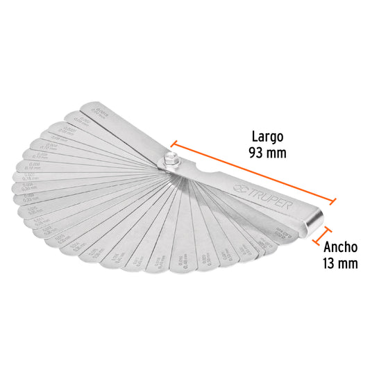 Proveedor:TruperCalibrador de 26 hojas std / mm, Truper Caja con 6, 14396Cuerpo de acero Graduación 0.04 mm - 0.63 mm