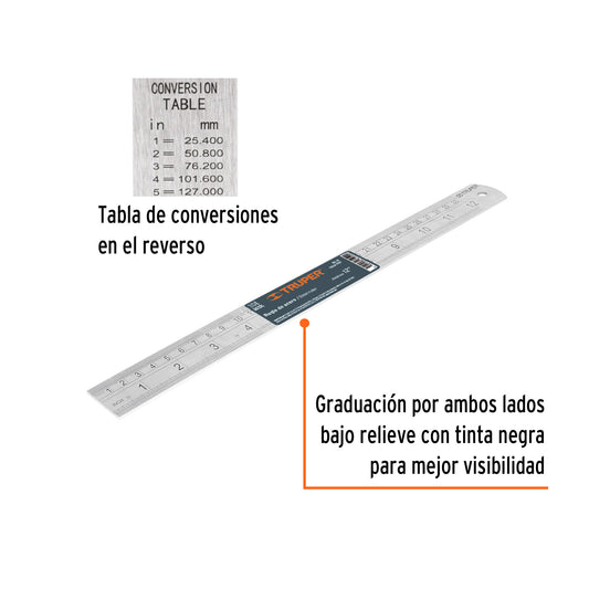 Proveedor:TruperRegla 30 cm de acero inoxidable, Truper Caja con 12, 14387Graduación (sistema metrico y standard) por ambos lados en bajo relieve con tinta negra para mejor visibilidad Tabla de conversiones...