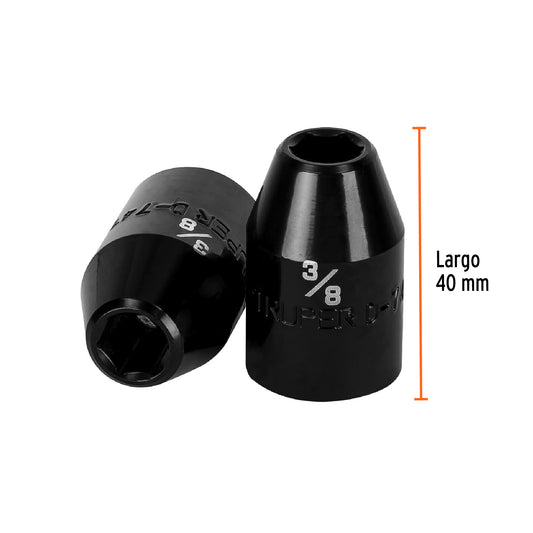 Proveedor:TruperDado de impacto de 3/8', 6 puntas, cuadro 1/2', Truper Caja con 6, 13375Fabricado en acero al cromo molibdeno con acabado fosfatado resistente a la corrosión Sistema de sujeción Truper-Drive con puntas convexas que...