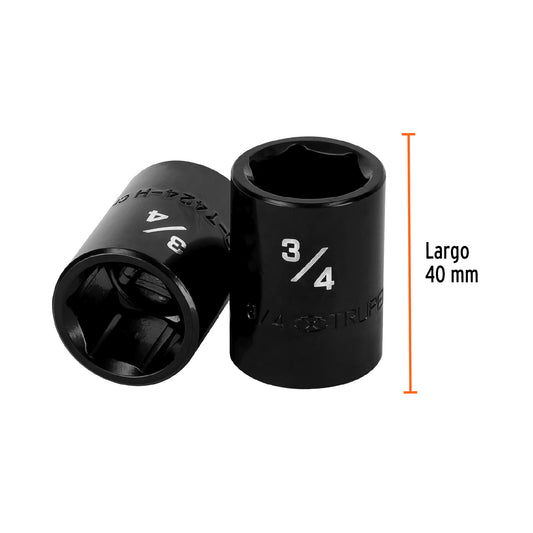 Proveedor:TruperDado de impacto de 3/4', 6 puntas, cuadro 1/2', Truper Caja con 6, 13381Fabricado en acero al cromo molibdeno con acabado fosfatado resistente a la corrosión Sistema de sujeción Truper-Drive con puntas convexas que...