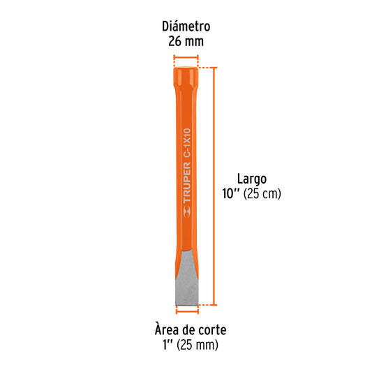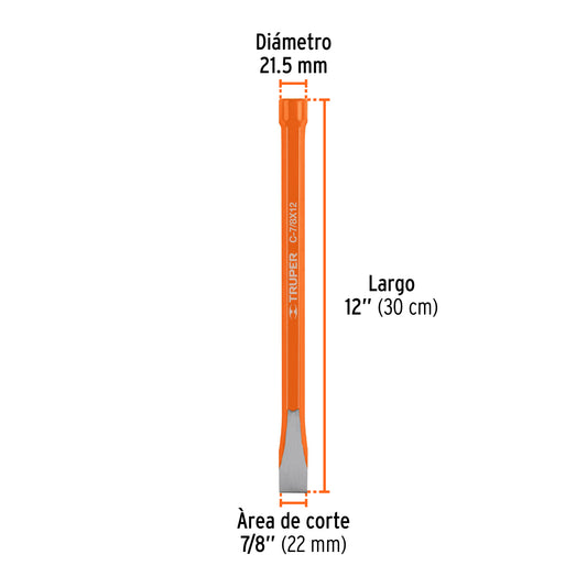 Proveedor:TruperCincel de corte frío 7/8 x 10' con grip, Truper Caja con 4, 12274Fabricado en acero al cromo vanadio Grip ergonómico de TPR que absorbe vibraciones y protege la mano de golpes accidentales ...