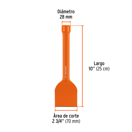 Proveedor:TruperCincel ladrillero 2-3/4 X 10' con grip, Truper Caja con 4, 12187Fabricado en acero al cromo vanadio Grip ergonómico de TPR que absorbe vibraciones y protege la mano de golpes accidentales ...