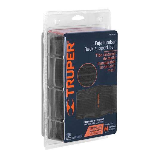 Proveedor:TruperFaja lumbar tipo cinturón de malla transpirable, M, Truper Caja con 2, 11961Fabricada de poliéster y elastano Cinturón de soporte abdominal con fijación hook and loop Flexible para mayor comodidad 3 Varillas para...