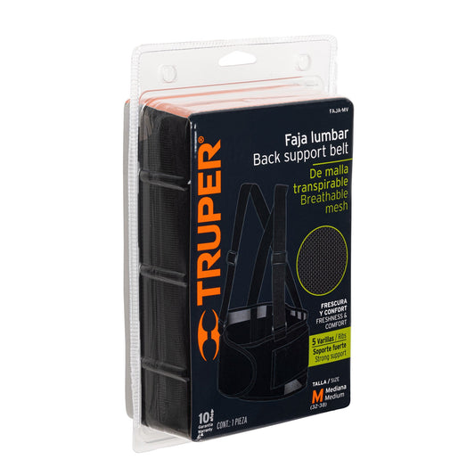 Proveedor:TruperFaja lumbar de malla transpirable, talla M, Truper Caja con 2, 11965Fabricada de poliéster y elastano Cinturón de soporte abdominal con fijación hook and loop Flexible para mayor comodidad 5 Varillas para soporte...