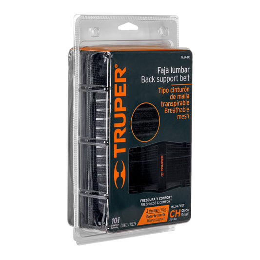Proveedor:TruperFaja lumbar tipo cinturón de malla transpirable, CH, Truper Caja con 2, 11960Fabricada de poliéster y elastano Cinturón de soporte abdominal con fijación hook and loop Flexible para mayor comodidad 3 Varillas para...