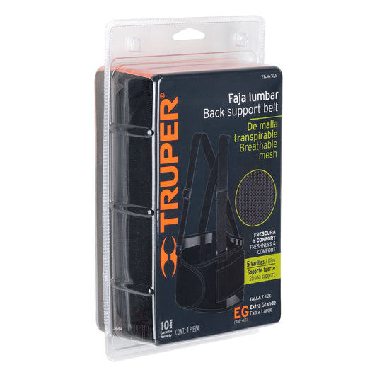Proveedor:TruperFaja lumbar de malla transpirable, talla XG, Truper Caja con 2, 11967Fabricada de poliéster y elastano Cinturón de soporte abdominal con fijación hook and loop Flexible para mayor comodidad 5 Varillas para soporte...