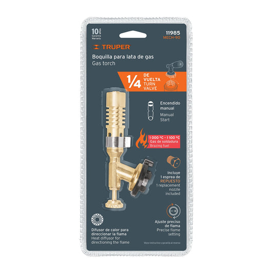 Proveedor:TruperBoquilla latón, enc. manual, p/lata de gas 1/4 de vuelta Caja con 6, 11985Fabricada de latón Ajuste preciso de flama Encendido manual Difusor de calor para direccionar la flama y calentar más rápido...