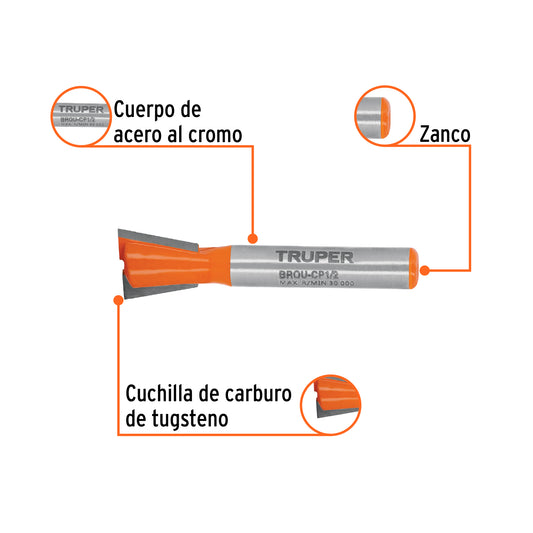 Proveedor:TruperBroca para router, cola de pato, 1/2', Truper Caja con 3, 11475Cuerpo de acero al cromo y cuchilla de carburo de tungsteno Zanco de 1/4" Para aplicaciones de fresado en router...