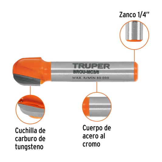 Proveedor:TruperBroca para router, media caña, 3/4', Truper Caja con 3, 11463Cuerpo de acero al cromo y cuchilla de carburo de tungsteno Zanco de 1/4" Para aplicaciones de fresado en router Cortes limpios...