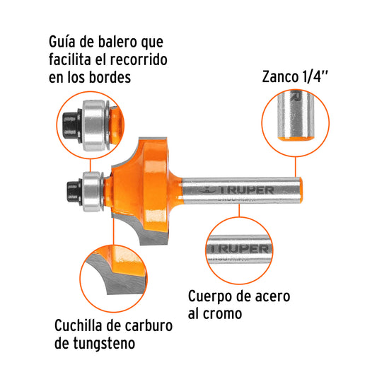 Proveedor:TruperBroca para router, redondeado con moldura, 1' con balero Caja con 3, 11472Cuerpo de acero al cromo y cuchilla de carburo de tungsteno Guía de balero que facilita el recorrido en bordes...