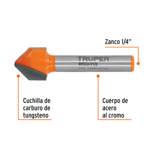 Proveedor:TruperBroca para router, corte en 'V', 1/2', Truper Caja con 3, 11466Cuerpo de acero al cromo y cuchilla de carburo de tungsteno Zanco de 1/4" Para aplicaciones de fresado en router...