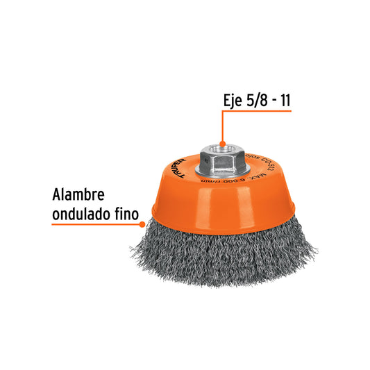 Proveedor:TruperCarda copa 5' alambre ondulado fino, eje 5/8'-11, Truper Caja con 4, 11535Fabricada en acero al carbono Acabado fino Compatibles con esmeriladoras Truper® y Pretul® Para superficies irregulares en limpieza de metales, eliminación...