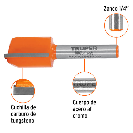 Proveedor:TruperBroca para router, recta 2 filos, 5/8', Truper Caja con 3, 11457Cuerpo de acero al cromo y cuchilla de carburo de tungsteno Zanco de 1/4" Para aplicaciones de fresado en router...