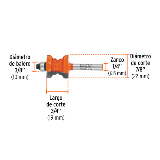 Proveedor:TruperBroca para router, collarin, 7/8' con balero, Truper Caja con 3, 10677Cuerpo de acero al cromo y cuchilla de carburo de tungsteno Guía de balero que facilita el recorrido en bordes...