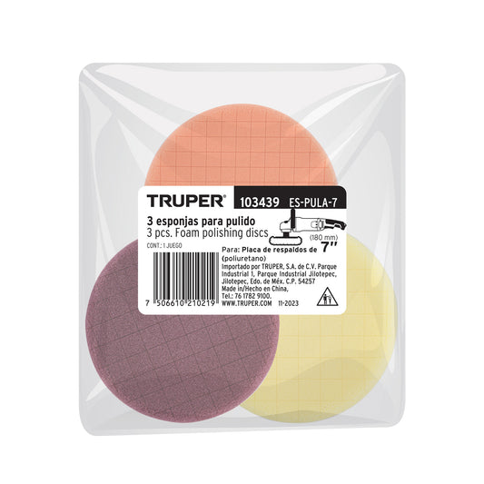 Proveedor:TruperJuego de 3 esponjas p/pulir de 7' hook and loop,TRUPER, 103439Fabricadas en poliuretano Para pulidoras modelos PULA-7N, PULA-7A3 marca Truper® y PULA-7P marca Pretul® Compatible con otras marcas del mercado...