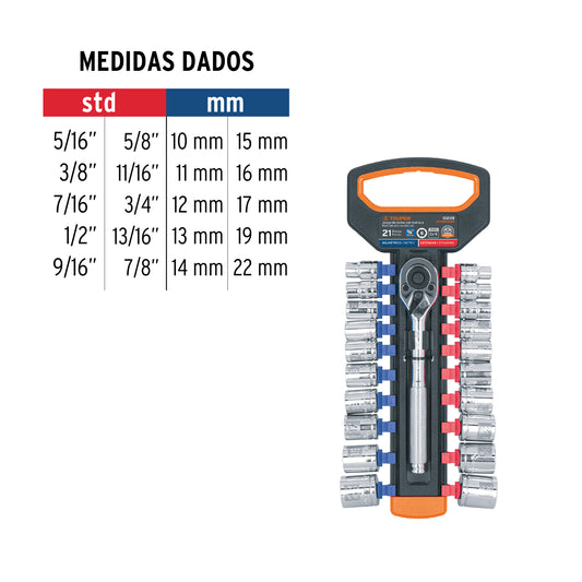 Proveedor:TruperJuego de dados mm y std con matraca, cuadro 1/2', Truper, 103110Dados y cuerpo de matraca en acero al cromo vanadio Matraca con botón de liberación rápida y mango moleteado antiderrapante para...