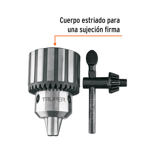 Proveedor:TruperBroquero 5/8' c/llave p/taladro d/piso TAPI-13/15/17,TRUPER Caja con 2, 102489Cono B16 Ajuste de mordazas con llave (incluida) Para taladros de piso modelos TAPI-13, TAPI-15 y TAPI-17 marca Truper®
