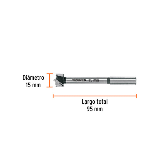 Proveedor:TruperBroca forstner 15 mm para madera, TRUPER Caja con 4, 102318Fabricada en acero al carbono Filo rectificado para cortes limpios y precisos Orificios con fondo plano (perforaciones ciegas) Uso sin percusión...