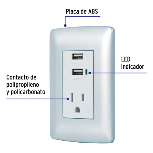 Proveedor:VolteckContacto aterrizado + 2 puertos USB, plata, línea Italiana Caja con 3, 49808
