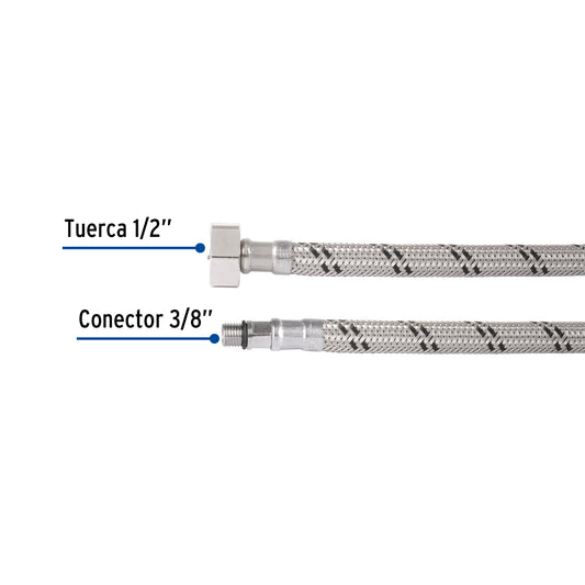Proveedor:FosetManguera para monomando, acero inox, 1/2' x 3/8' UNF, 55cm Caja con 6, 49202Tuerca 1/2" y conector 3/8" de latón niquelado Espiga de latón resistente a la corrosión Férulas de acero inoxidable Trenzado de acero...