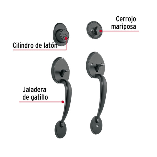 Proveedor:HermexJaladera, perilla y cerrojo llave-mariposa, negro, 48437Juego de cerraduras jaladera con gatillo y perilla Cerrojos con llave al exterior y mariposa al interior Cilindros de latón...