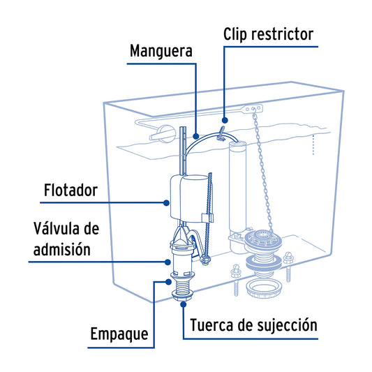 Proveedor:FosetVálvula de llenado c/flotador compacto,regulación con clip Caja con 4, 48445Cuerpo de POM Flotador de polipropileno Empaque de hule Manguera de PVC Llenado rápido