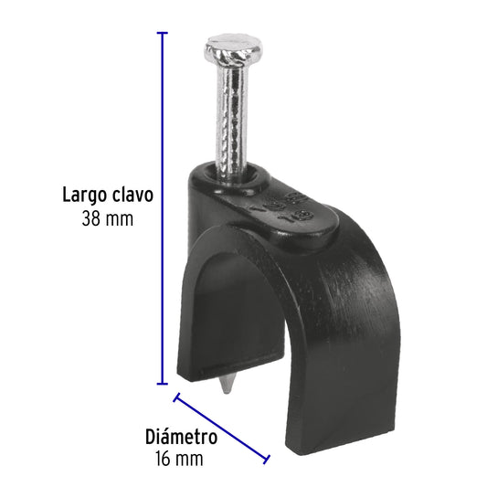 Proveedor:VolteckBolsa con 20 grapas negras de 16 mm para cable redondo Caja con 10, 48284Fabricadas en polietileno Incluye clavo Para cables coaxiales o cables redondos