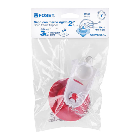 Proveedor:FosetSapo 2' para WC, silicona, marco rígido, cadena inox, Foset Caja con 6, 48289Sello de silicona de larga duración Cadena de acero inoxidable Marco rígido para asegurar un sellado perfecto en cada descarga...
