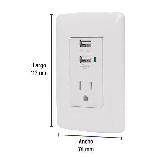 Proveedor:VolteckContacto aterrizado + 2 puertos USB, blanco, línea Italiana Caja con 3, 48065Placa de ABS, contacto de polipropileno y policarbonato LED indicador de carga Puertos USB tipo A, para cargar 2 celulares simultáneamente...
