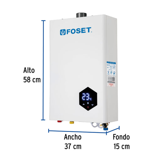 Proveedor:FosetCalentador instantáneo modulante, 24L, 4 serv, gas LP, Foset, 48017Enciende automáticamente al detectar demanda de agua caliente a temperatura previamente configurada, aun con variación de flujo de agua Display...