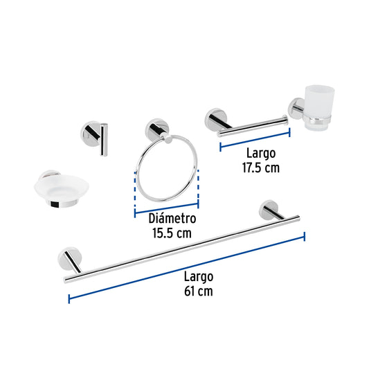 Proveedor:FosetJuego de 6 accesorios para baño acabado cromo, Foset Tubig, 47973Barra y argolla fabricados en acero inoxidable Plato y vaso de vidrio esmerilado Portapapel metálico Con sistema de montaje para semiempotrar...