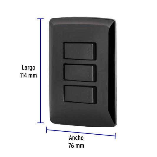 Proveedor:VolteckPlaca armada 3 interruptores sencillos,negro, línea Italiana Caja con 3, 47595Fabricadas en ABS, polipropileno 2 Interruptores sencillos y 1 de 3 vías tipo escalera con retardante a la flama para mayor...