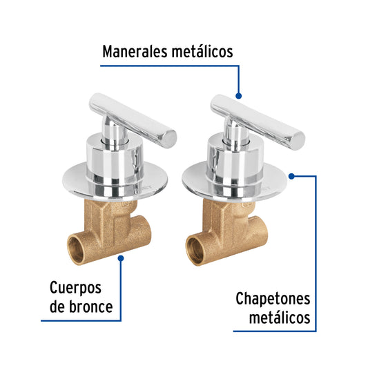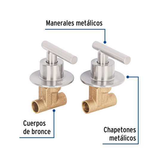 Proveedor:FosetJuego llaves empotrar soldables, volante cromo, Túbig, 46786Cuerpos de bronce con 80% de cobre para máxima duración Manerales tipo volante y chapetón metálico Alta resistencia a la...