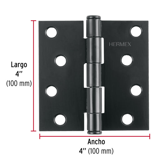 Proveedor:HermexBisagra cuadrada 4', negro mate, cabeza plana, Hermex Caja con 10, 46709Fabricada en acero con acabado negro mate Perno suelto con cabeza plana 30% Mayor espesor que las marcas tradicionales Para uso...