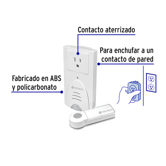 Proveedor:VolteckTimbre inalámbrico con receptor para enchufar, 1 tono Caja con 4, 46631Fabricado en ABS y policarbonato El timbre se conecta a un contacto de pared Fácil instalación
