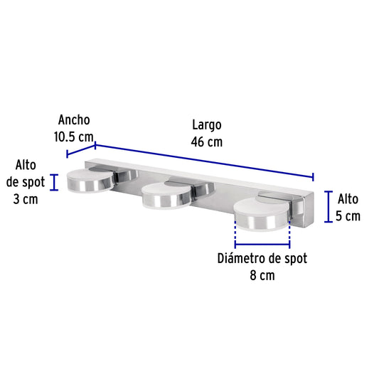 Proveedor:VolteckArbotante decorativo de LED 10 W con 3 spots para baño, 46346Ahorra hasta 60% en el consumo de energía Soporte de acero inoxidable, cuerpo de aluminio y pantalla de acrílico Encendido instantáneo (proporciona...