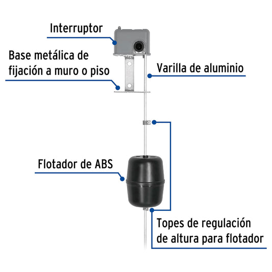 Proveedor:FosetInterruptor eléctrico para flotador, Foset, 46379Cubierta de polipropileno Flotador de ABS Varilla de aluminio Soporte de acero galvanizado Circuito de potencia para cerrar los contactos...