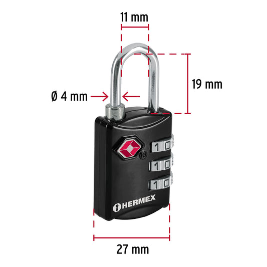 Proveedor:HermexCandado maletero de combinación 27 mm seguridad TSA, blíster Caja con 6, 46291Cuerpo metálico y gancho de acero Combinación personalizable de 3 dígitos Se adapta a la mayoría de las cremalleras de...