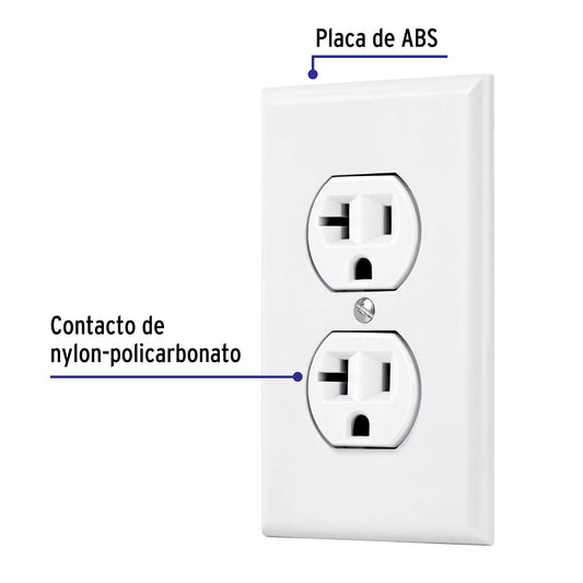 Proveedor:VolteckPlaca armada contacto dúplex,2 polos, línea Standard, blanco Caja con 3, 45951Placa de ABS, contacto e interruptor en nylon-policarbonato Con retardante a la flama para mayor seguridad