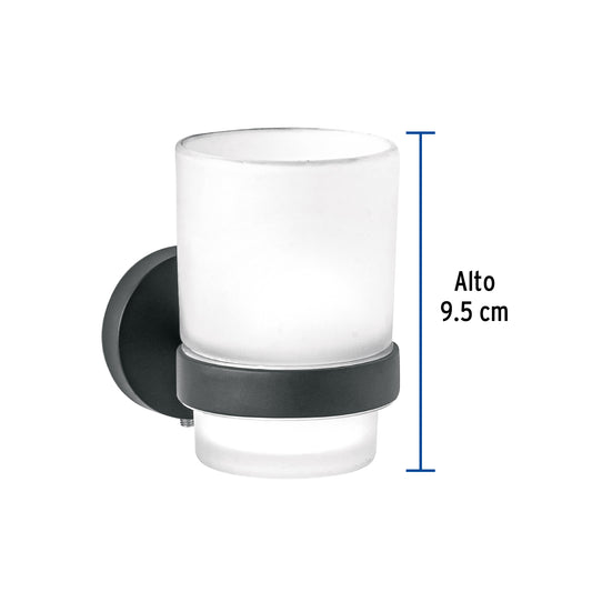 Proveedor:FosetPortavaso cepillero negro con vaso de vidrio, Foset Túbig Caja con 6, 45957Portavaso metálico Vaso de vidrio esmerilado Con sistema de montaje para semiempotrar Incluye llave allen, taquetes y tornillería para su instalación...